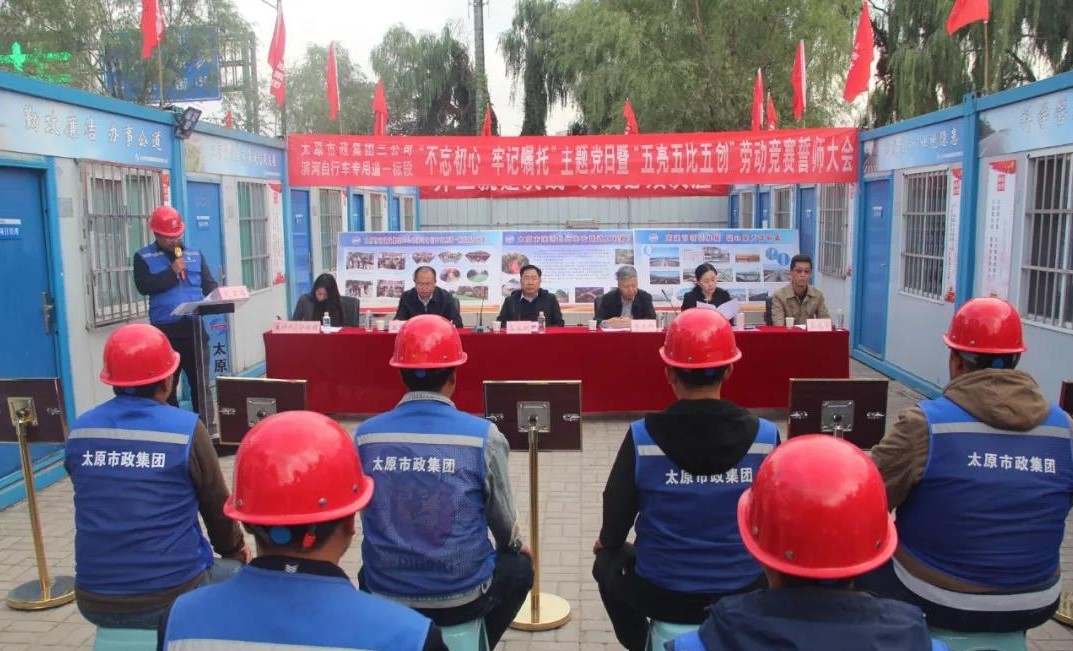 會上,三公司經(jīng)理栗建軍介紹了濱河自行車專用道工程一標(biāo)段工程概況及施工進展情況。該工程道路負(fù)責(zé)人、三公司副經(jīng)理柳文斌宣讀了《太原市政集團第三工程公司濱河自行車道一標(biāo)段“五亮五比五創(chuàng)”勞動競賽實施方案》。參會領(lǐng)導(dǎo)為以工區(qū)負(fù)責(zé)人姓名命名的5個工區(qū)授旗,全體參建人員進行集體宣誓。集團公司勞動模范、該工程橋梁負(fù)責(zé)人、三公司副經(jīng)理郝俊軍分享了他的奮斗故事。第七工區(qū)負(fù)責(zé)人武瑞杰代表各工區(qū)進行表態(tài)發(fā)言,表示將自我加壓、勇挑重?fù)?dān),為濱河自行車專用道工程決戰(zhàn)攻堅貢獻青春智慧和力量。