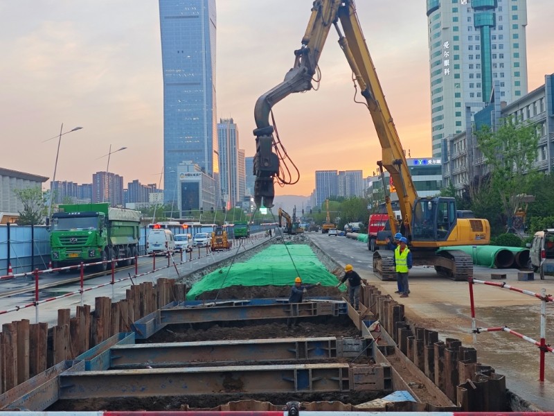 “追求精細極致,鑄就基坑支護的穩(wěn)固防線”。項目部將鋼板樁施打質(zhì)量視為確保基坑安全與質(zhì)量的關鍵環(huán)節(jié),嚴格執(zhí)行材料準入制度,所有進場鋼板樁均經(jīng)過材質(zhì)證明核查、尺寸精度測量和外觀質(zhì)量檢驗三重把關,確保樁身無裂紋、無銹蝕等質(zhì)量缺陷,從源頭上杜絕不合格材料。施工中,施工人員采用全站儀進行動態(tài)監(jiān)測,嚴格控制樁身垂直度偏差在規(guī)定范圍內(nèi),詳細記錄每根樁的打入深度、貫入度等關鍵參數(shù)。拔樁階段采用專用施工設備,按照“先支后拆、分段拔除”的原則有序進行,拔樁后出現(xiàn)的孔隙立即灌砂,最大限度減少對周邊土體的擾動,實現(xiàn)平穩(wěn)施工與環(huán)境保護的和諧統(tǒng)一。